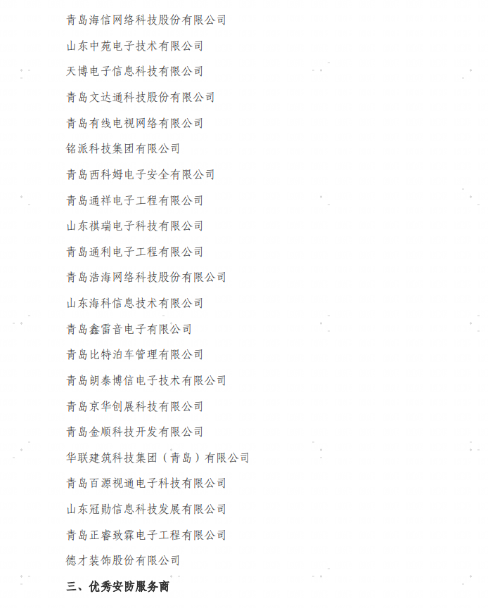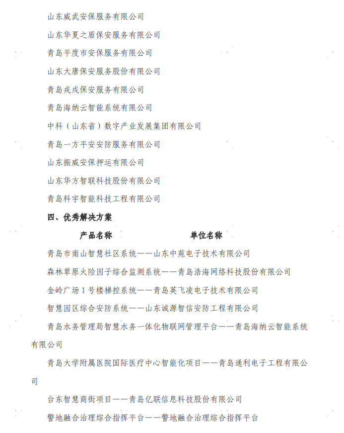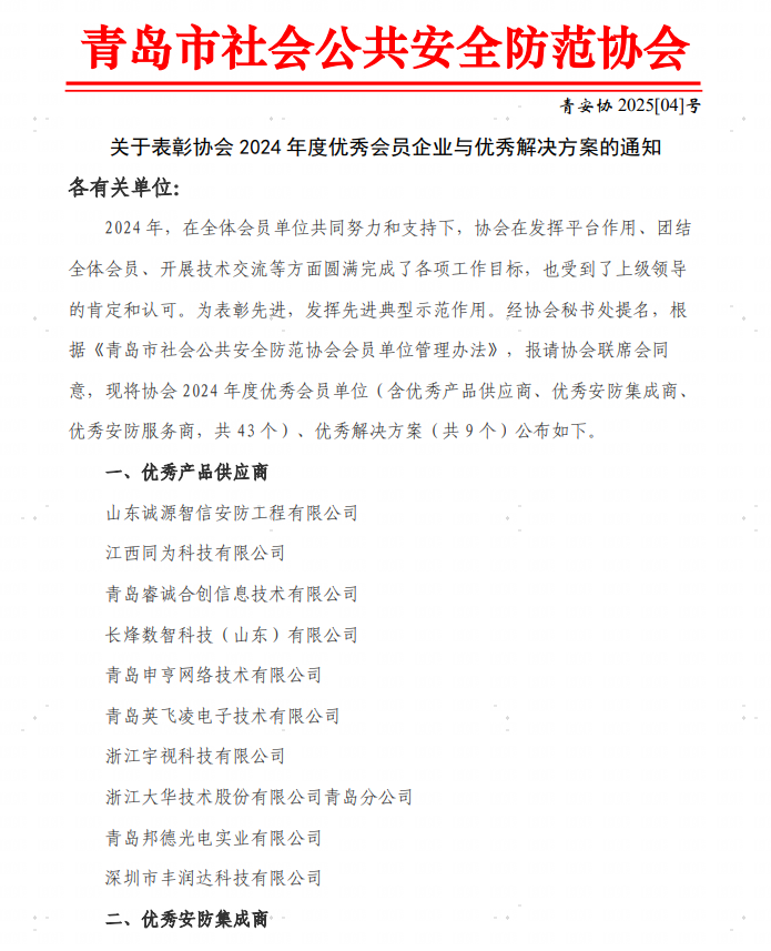 2024年,在全體會員單位共同努力和支持下,協會在發揮平臺作用、團結全體會員、開展技術交流等方面圓滿完成了各項工作目標,也受到了上級領導的肯定和認可。為表彰先進,發揮先進典型示范作用。經協會秘書處提名,根據《青島市社會公共安全防范協會會員單位管理辦法》,報請協會聯席會同意,現將協會2024年度優秀會員單位(含優秀產品供應商、優秀安防集成商、優秀安防服務商,共43個)、優秀解決方案(共9個)公布如下。