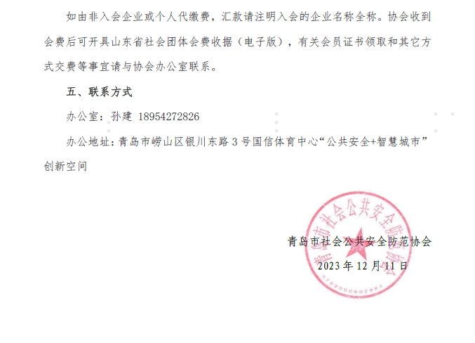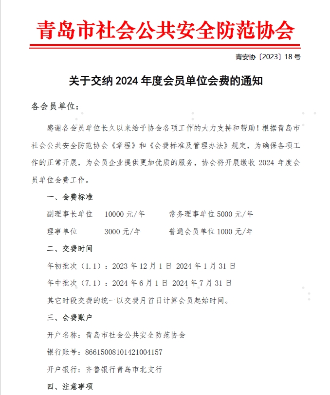 關于交納青島市社會公共安全防范協會2024年會費的通知